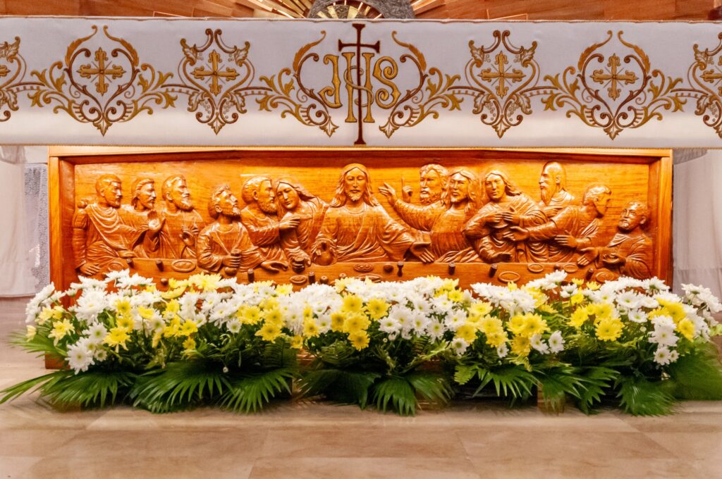 Dominating the sanctuary with solemn grace is the Sindonic Crucifix, a masterpiece sculpted by artist Ian Vicente. Raised high above the altar, it draws every gaze heavenward, inviting deep contemplation of the mystery of Christ’s Passion.