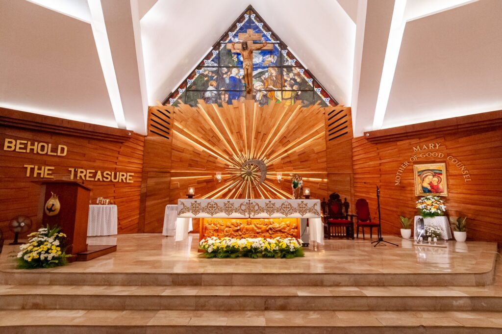 Encircling the worship space are the Stations of the Cross, sacred icons that accompany the faithful in contemplating the mystery of Christ’s Passion. The pews, crafted from native narra wood, speak of simplicity and strength — the faithful gathered as one body, rooted in the soil of their own land.